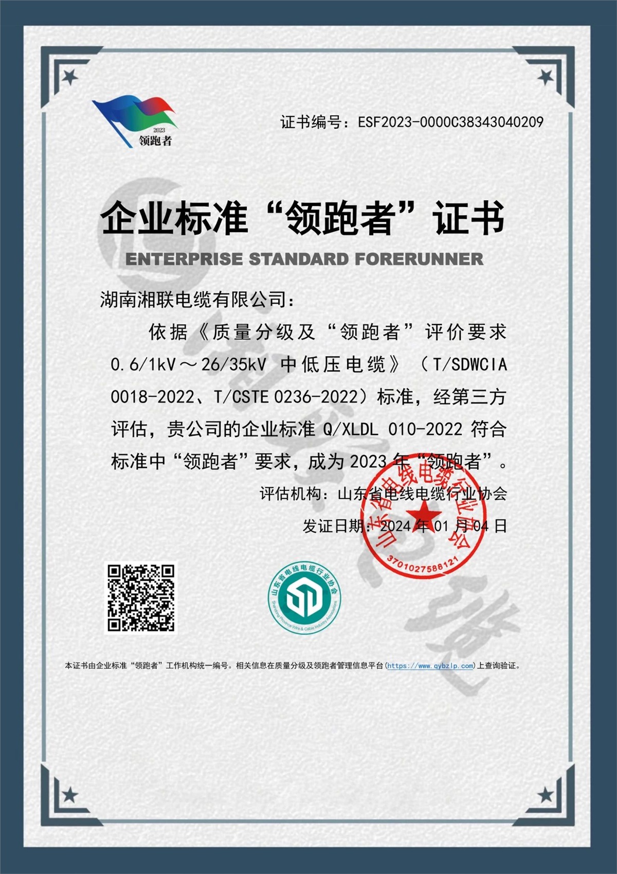 1月,企業(yè)標(biāo)準(zhǔn)領(lǐng)跑者管理信息平臺公布了2023年企業(yè)標(biāo)準(zhǔn)領(lǐng)跑者名單,湖南湘聯(lián)電纜有限公司憑借企業(yè)標(biāo)準(zhǔn)Q/XLDL 010-2022,成為2023年企業(yè)標(biāo)準(zhǔn)“領(lǐng)跑者”,湘聯(lián)電纜連續(xù)三年獲此殊榮。