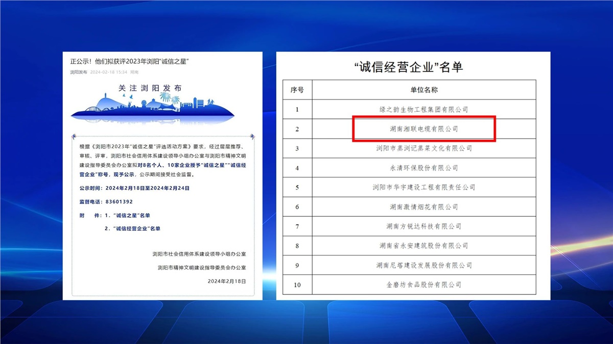 2月,瀏陽市社會信用體系建設(shè)與瀏陽市精神文明建設(shè)指導(dǎo)委員會辦公室聯(lián)合開展的瀏陽市2023年“誠信之星”評選進(jìn)行公示,湖南湘聯(lián)電纜有限公司成功入選,成為2023年“誠信之星”。