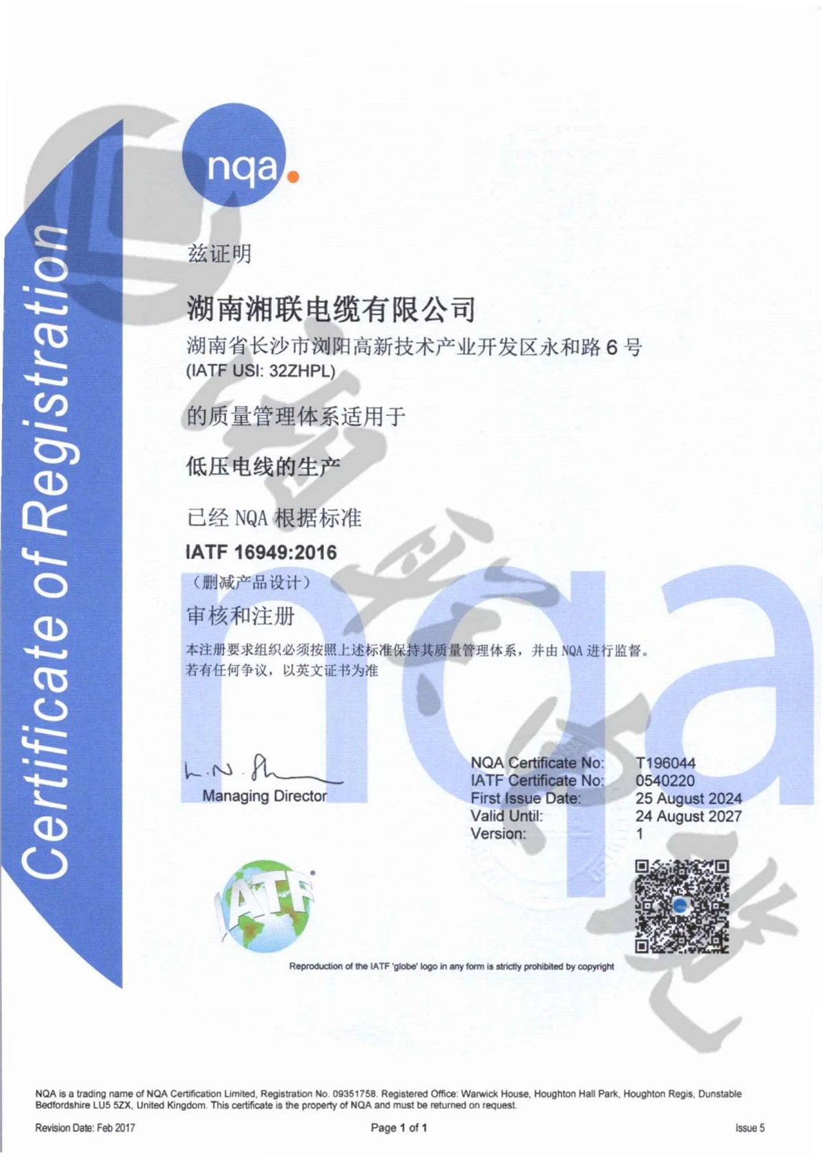 9月,湘聯(lián)電纜成功獲得了IATF16949:2016質(zhì)量管理體系認(rèn)證。IATF 16949:2016標(biāo)準(zhǔn)是專為汽車行業(yè)設(shè)計(jì)的質(zhì)量管理體系標(biāo)準(zhǔn),此項(xiàng)認(rèn)證標(biāo)志著湘聯(lián)電纜在質(zhì)量管理體系、產(chǎn)品品質(zhì)等方面均已滿足汽車行業(yè)的高質(zhì)量管理標(biāo)準(zhǔn)。